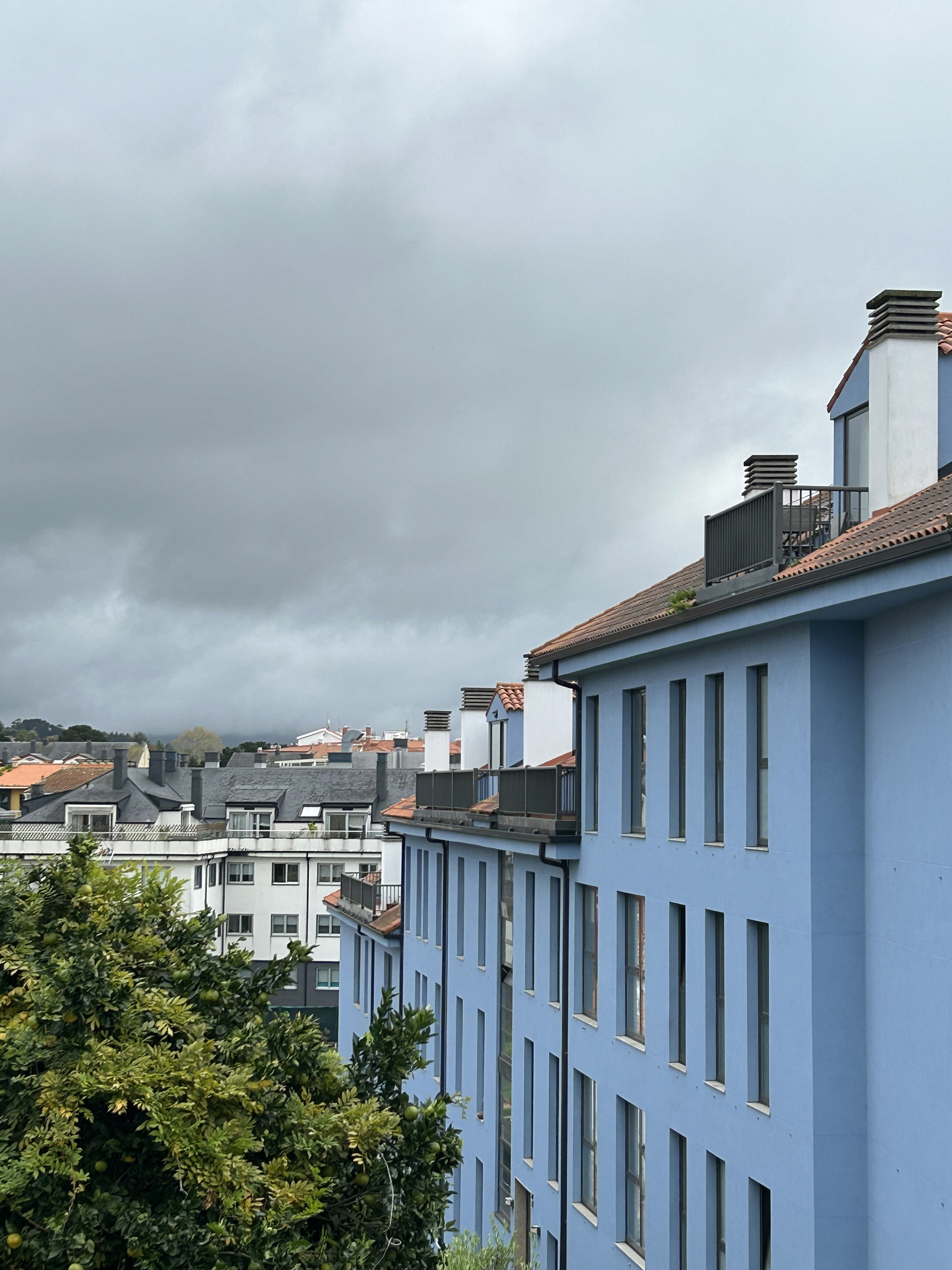 - Descripción da fotografía: Nesta imaxe pódese apreciar que no edificio azul as súas ventás son rectangulares e mostran patróns de simetría e repetición ao longo do edificio, como tamén se observa nos balcóns. A colocación do edificio hacia o fondo da imaxe crea una perspectiva lineal onde as líneas parecen dirixirse hacia un mesmo punto o que crea o punto de fuga e lle da profundidade a imaxe. O que tamén axuda a que isto se vexa son as paredes e os bordes das ventás que crean líneas perpendiculares e paralelas. Tamén nesta imaxen aparecen ángulos rectos entre as peredes e o teito, e no tellado se aprecian ángulos agudos.