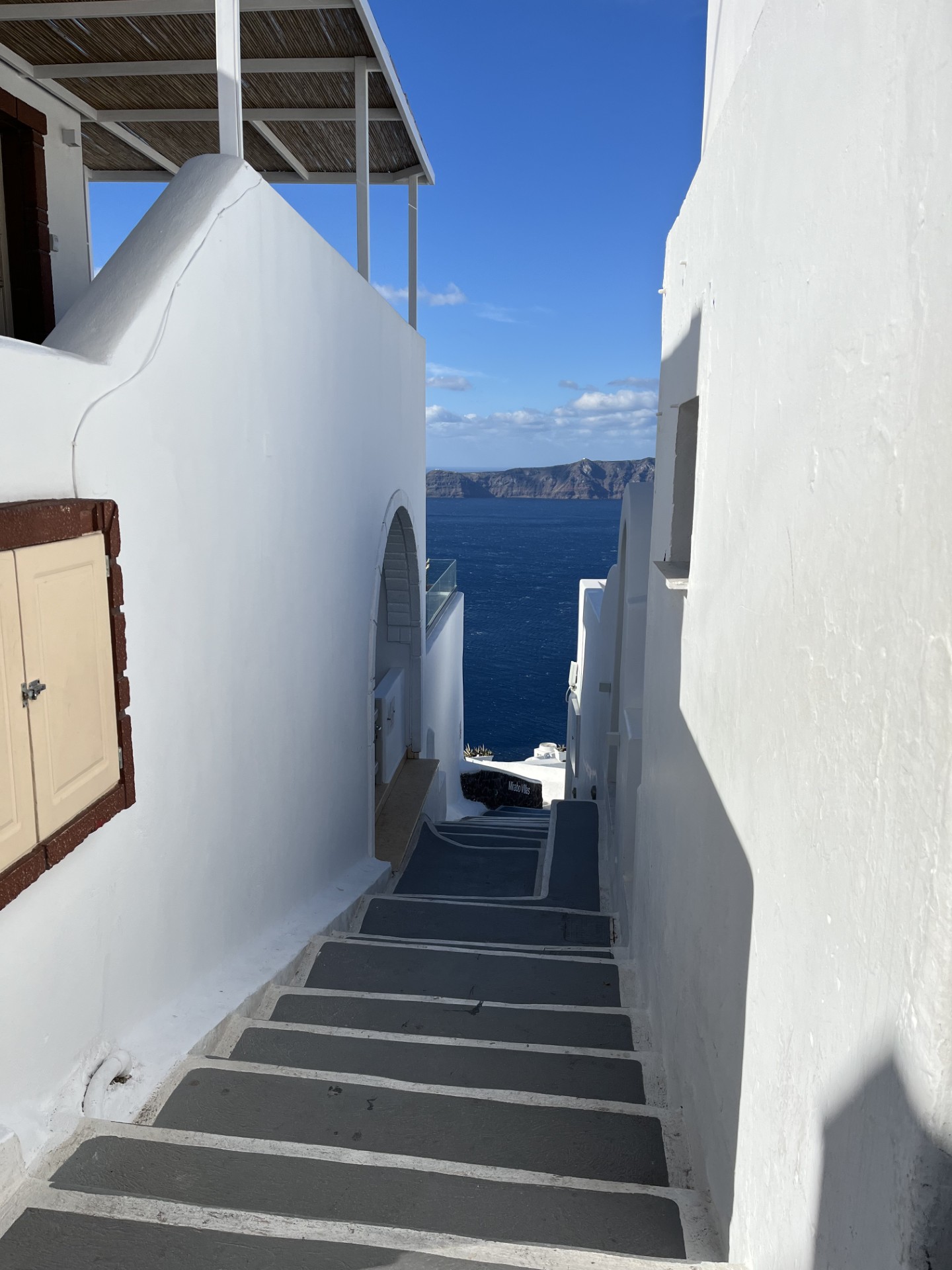 A isla de Santorini está nun acantilado, a maioria das rúas son costa abaixo